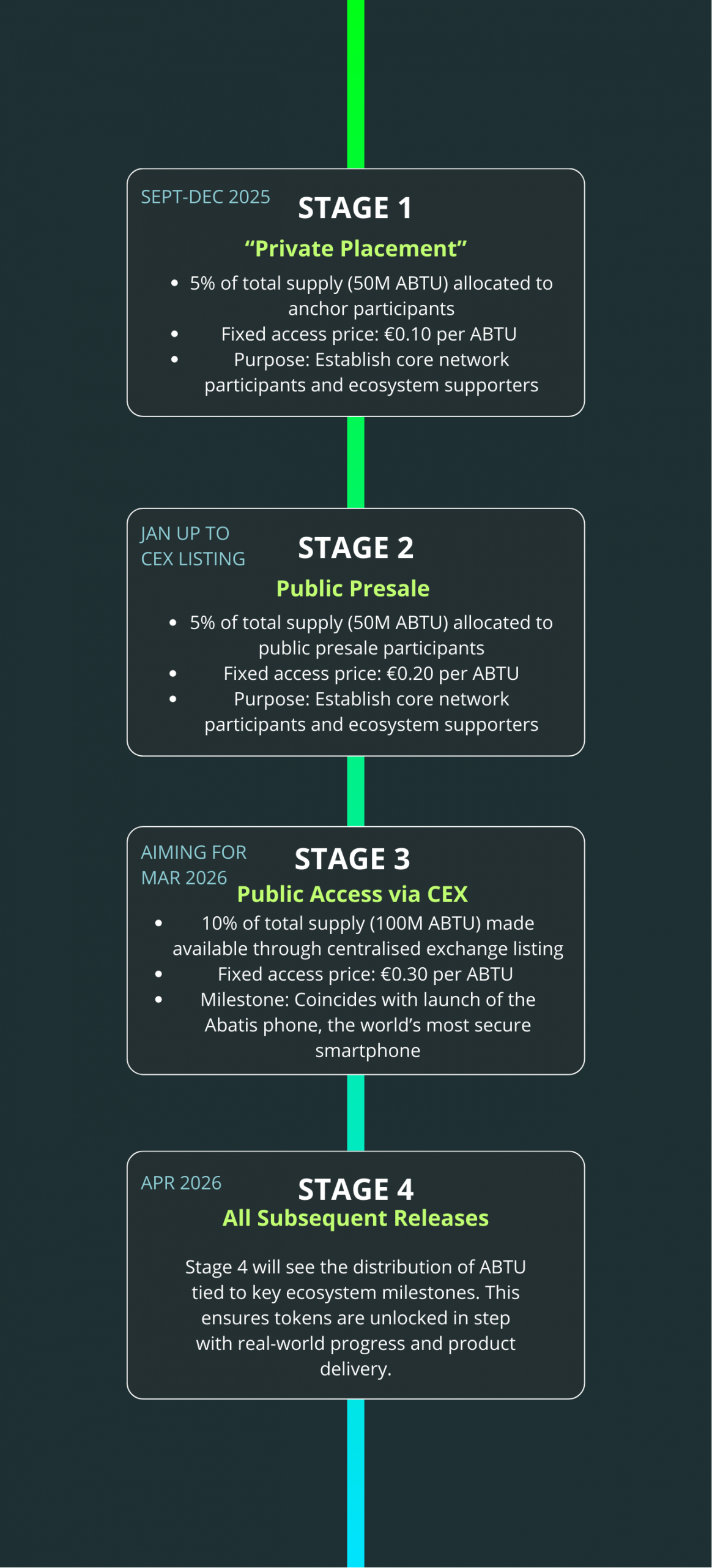 - Initial Public Sale (CEX Listing): Fixed price of €0.30 per ABTU, coinciding with the launch of the Abatis smartphone.