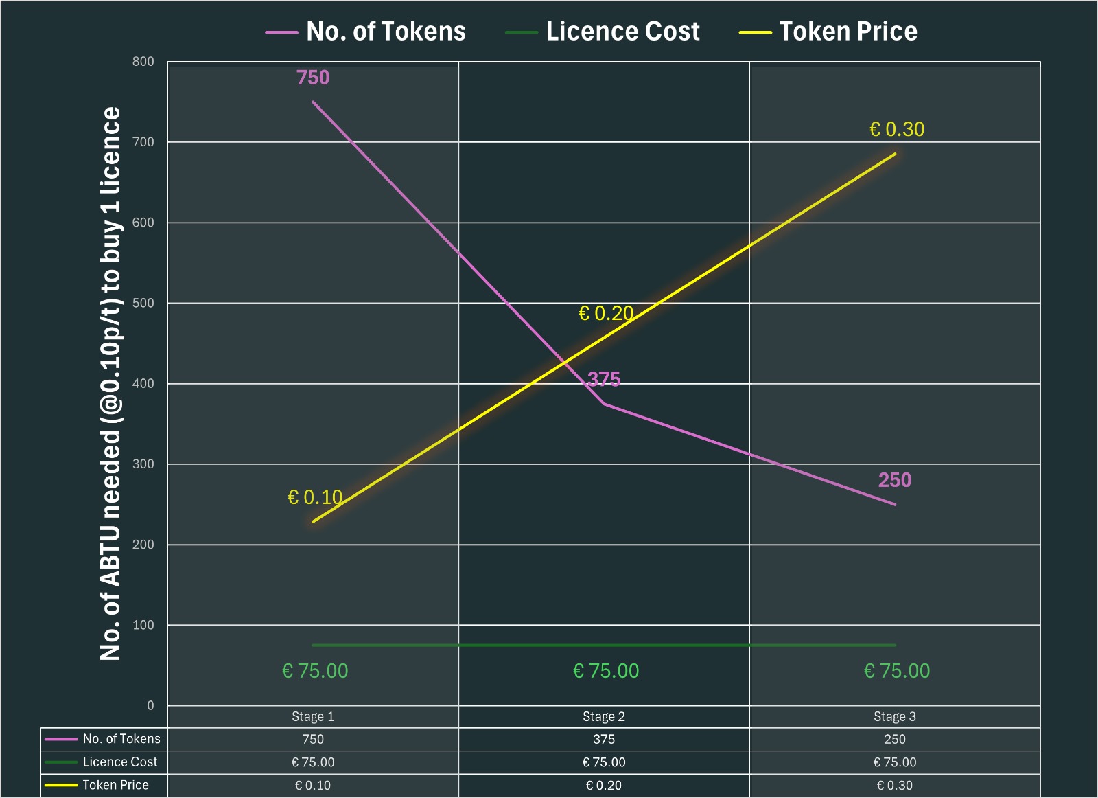 - Utility Access During Lock: Even while trading is restricted, Stage 1 participants can redeem 20% of ABTU at their entry value (€0.10) against Abatis licences. For example, a licence priced at €75 per annum equals 750 ABTU at Stage 1 pricing, giving holders immediate, tangible value.